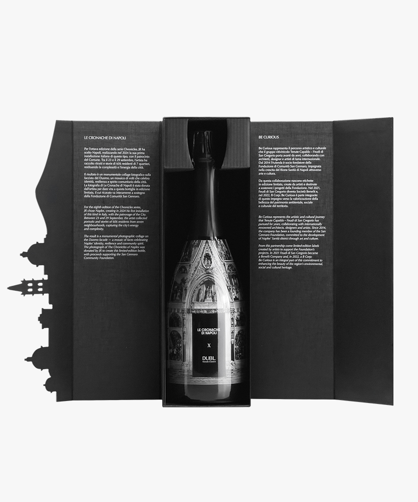 L’arte di JR diventa un’edizione limitata per sostenere il Rione Sanità: un progetto che unisce arte, vino e impegno sociale, ispirato all’opera realizzata dal celebre artista francese sulla facciata del Duomo di Napoli nell’ambito della mostra “Chi sei, Napoli?”. La fotografia dell’opera “Le Cronache di Napoli”, che avvolge la bottiglia, è stata donata dall’artista per dare vita a questa edizione speciale, il cui ricavato sarà devoluto interamente alla Fondazione di Comunità San Gennaro.