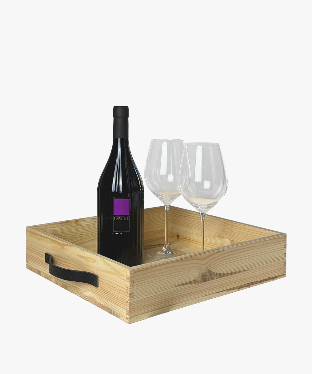 La speciale cassetta in legno con manici in pelle che diventa vassoio contiene: